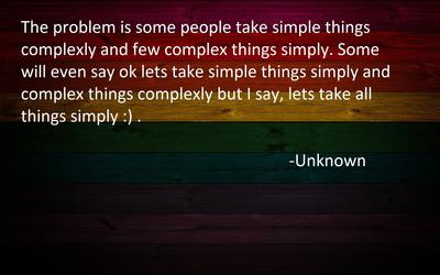 "The problem is some people take simple things complexly and few complex things simply. Some will even say ok lets take simple things simply and complex things complexly but I say, lets take all things simply :)."